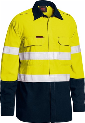 Twin Bisley signature single mitred chest pockets with plastic press snap flap closure and left pocket with pen division