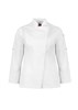 Mandarin collar with apron tab to hold apron in place.