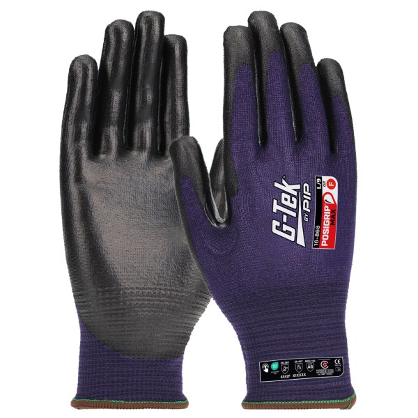 G-Tek PosiGripMAX 18G seamless knit glove with HPPE/nylon/spandex blended liner, and Posigrip Max coating on palm and fingers.