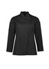Mandarin collar with apron tab to hold apron in place.